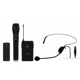 - 2 microfonos inalambricos UHF, 1 de mano y 1 de cabeza (650 MHz y 660 MHz) respectivamente.