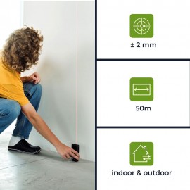 Gracias a este distanciometro laser digital, cada detalle se muestra con una precision de 1 mm, en un impresionante rango de 0,05 a 50 metros. El medidor, seguro de usar, ofrece varias funciones, como medicion de superficie, volumen y altura, ademas de medicion continua para mayor flexibilidad en el lugar de trabajo. Su robusto diseño cuenta con la certificacion IP54, por lo que esta preparado para cualquier trabajo en interiores y exteriores, con el apoyo de una bateria de larga duracion de 5000 a 8000 mediciones.